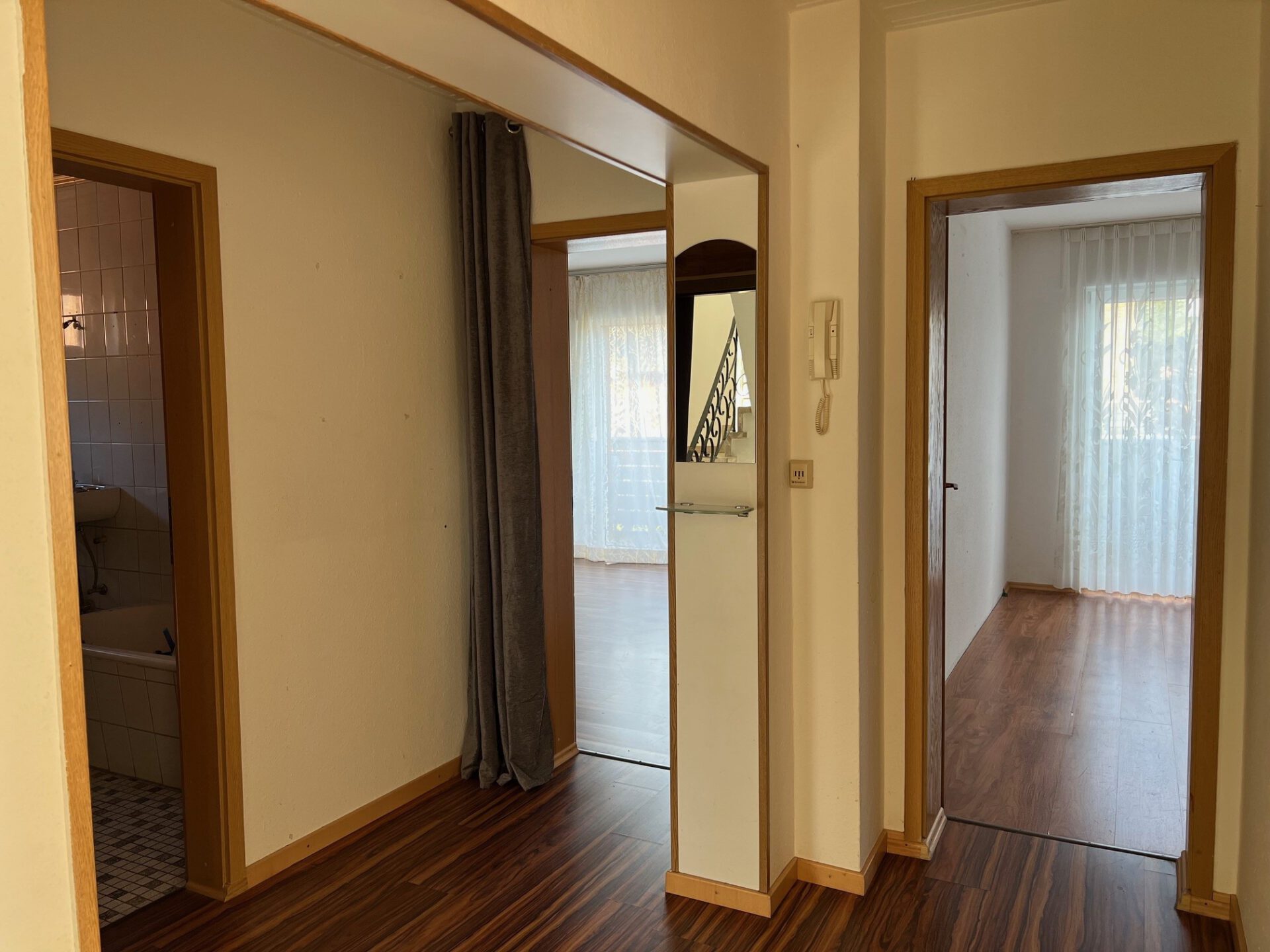 Bereits beim Betreten empfängt Sie eine großzügige Diele mit ansprechendem Treppenhaus. Ein integrierter Schuhschrank sowie ein ehemaliges Gäste-WC, das aktuell als Abstellraum genutzt wird, runden diesen Bereich ab. Die vorhandenen Anschlüsse ermöglichen eine unkomplizierte Wiederherstellung als WC.